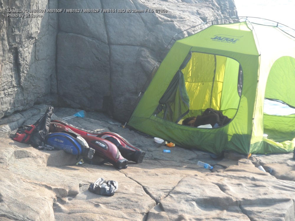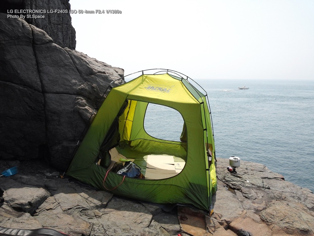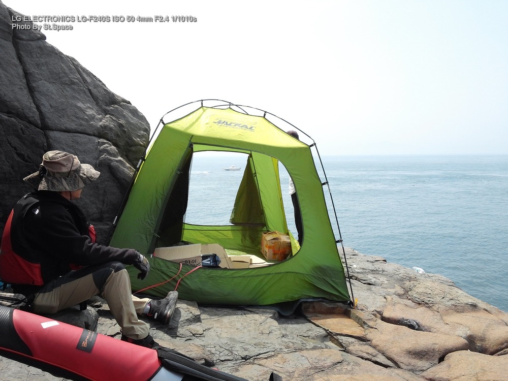 갯바위에는 텐트를 칠만한 공간들이 제한적이기 때문에, 큰 텐트를 칠 수 없어서, 캐빈형 텐트를 설치합니다.