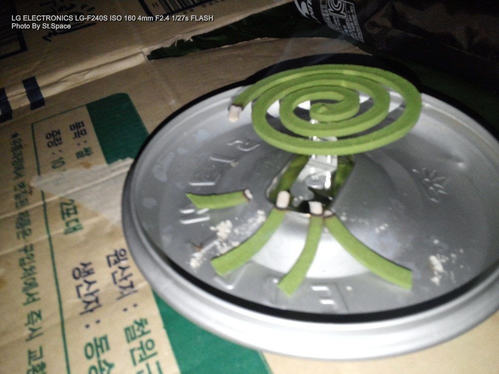 안전을 위해 코펠 뚜껑에 모기향을 피우고, 강력함을 더하기 위해서, 똑똑 끊어서 몇 개를 동시에 피운 효과를 내봅니다.