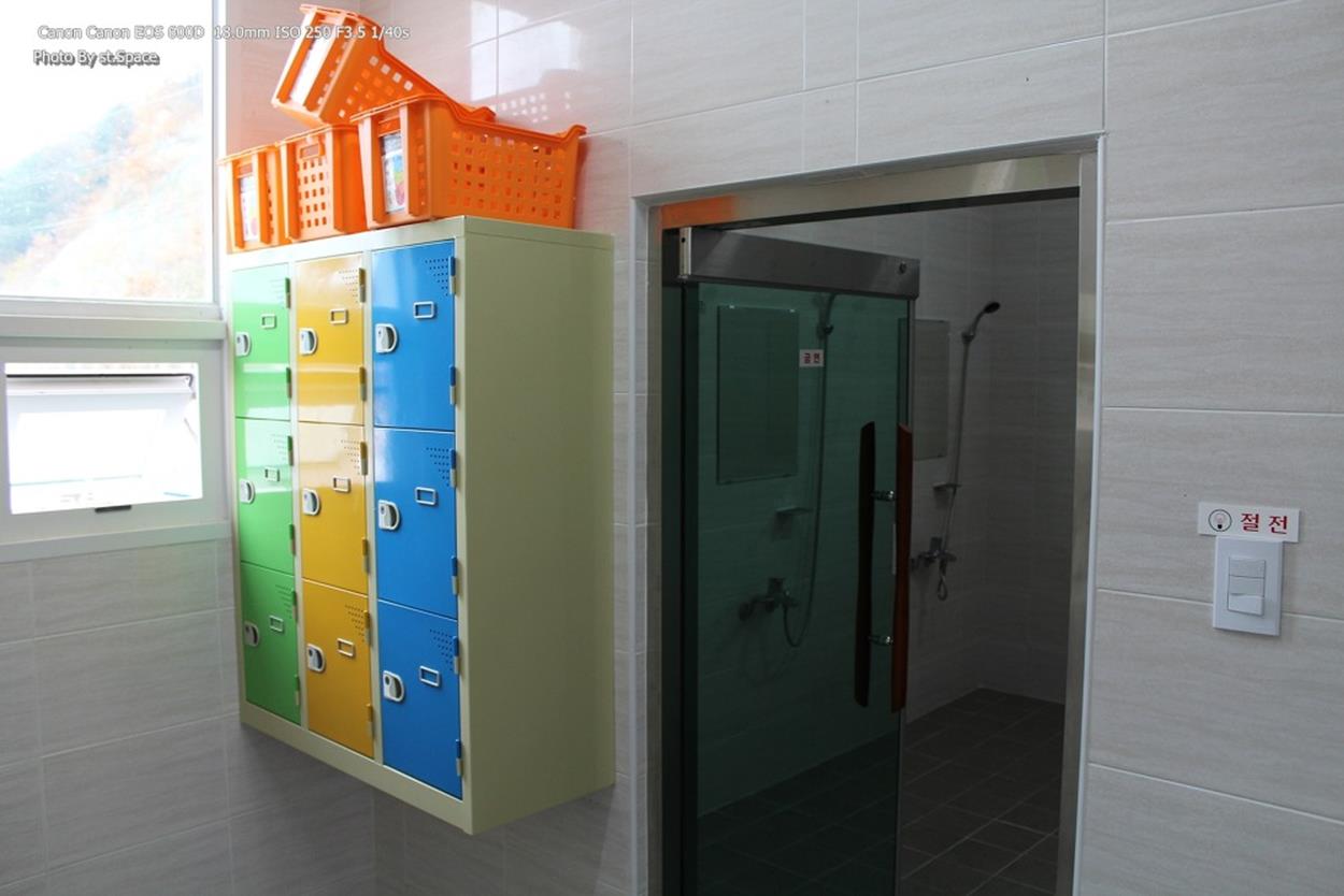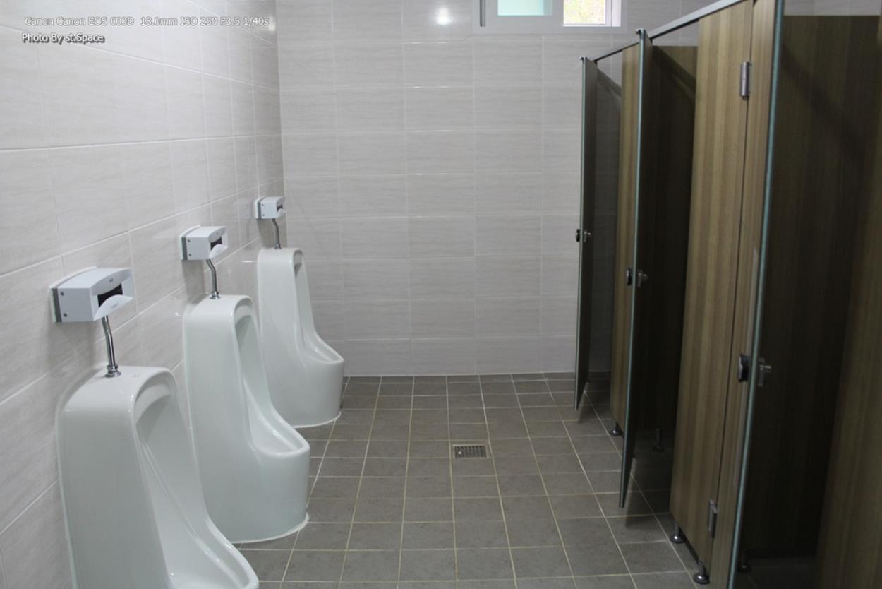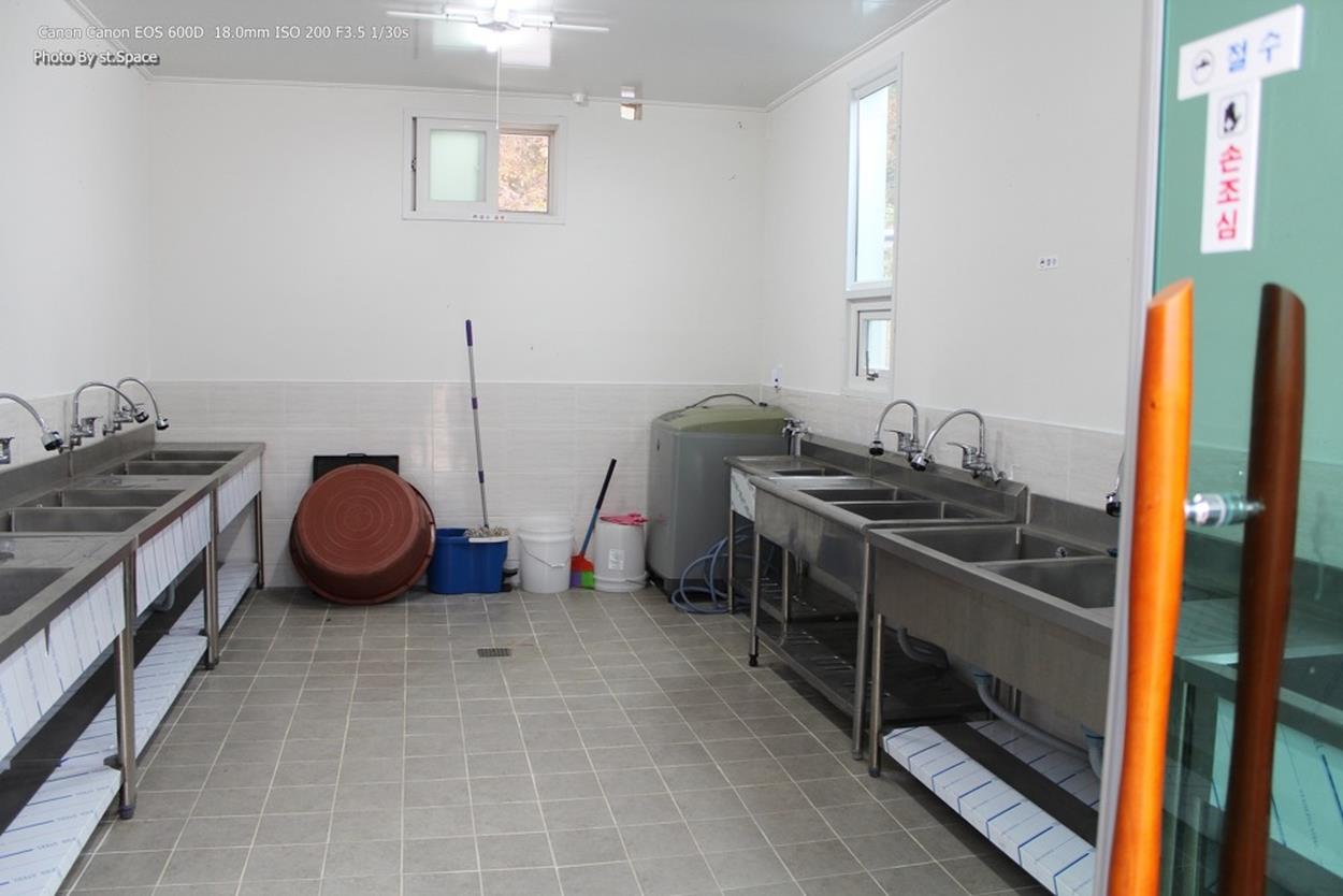 세척실은 넑직하고 깔끕해요. 싱크대도 널직해서, 성수기에도 옆사람과 어깨 부딛힐일 없어 보이구요. 온수가 나옵니다.