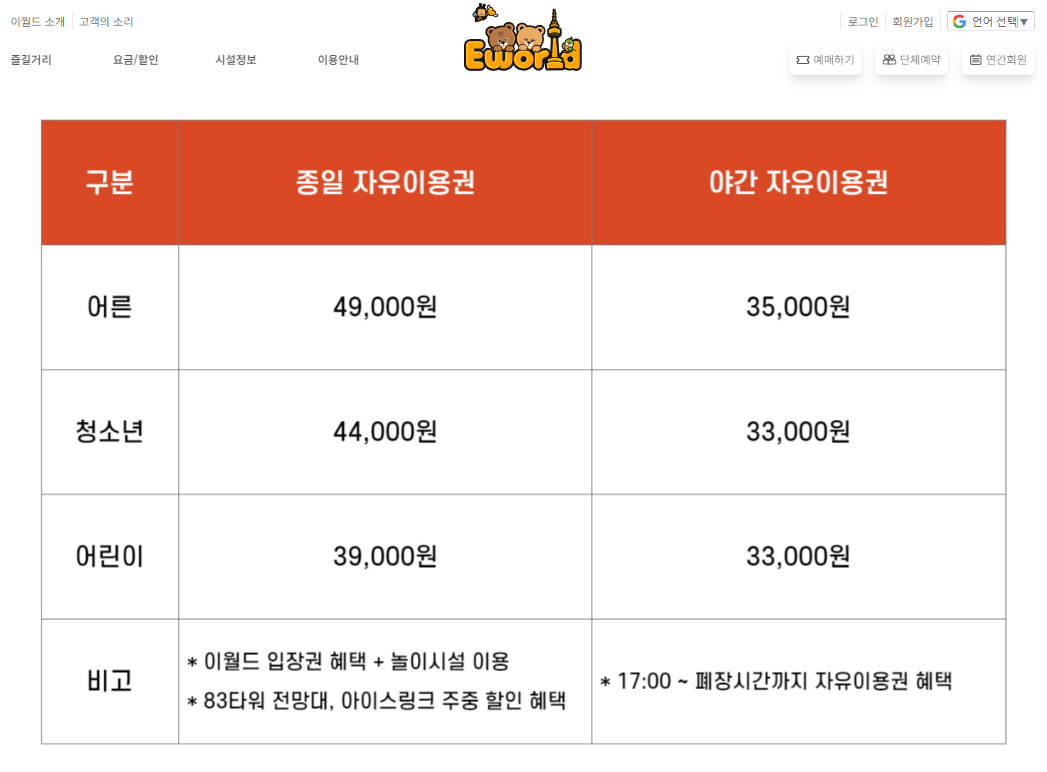 - 특별 혜택 및 할인 제외 항목: 주차요금, 코인시설물, 일부 이벤트시설물 등은 별도 요금이 적용됩니다.