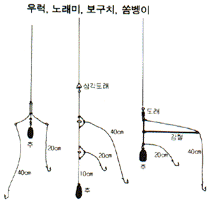 - 500원짜리 봉돌(20~40g) + 2단~3단 바늘(조기바늘, 우럭바늘 6~8호)
