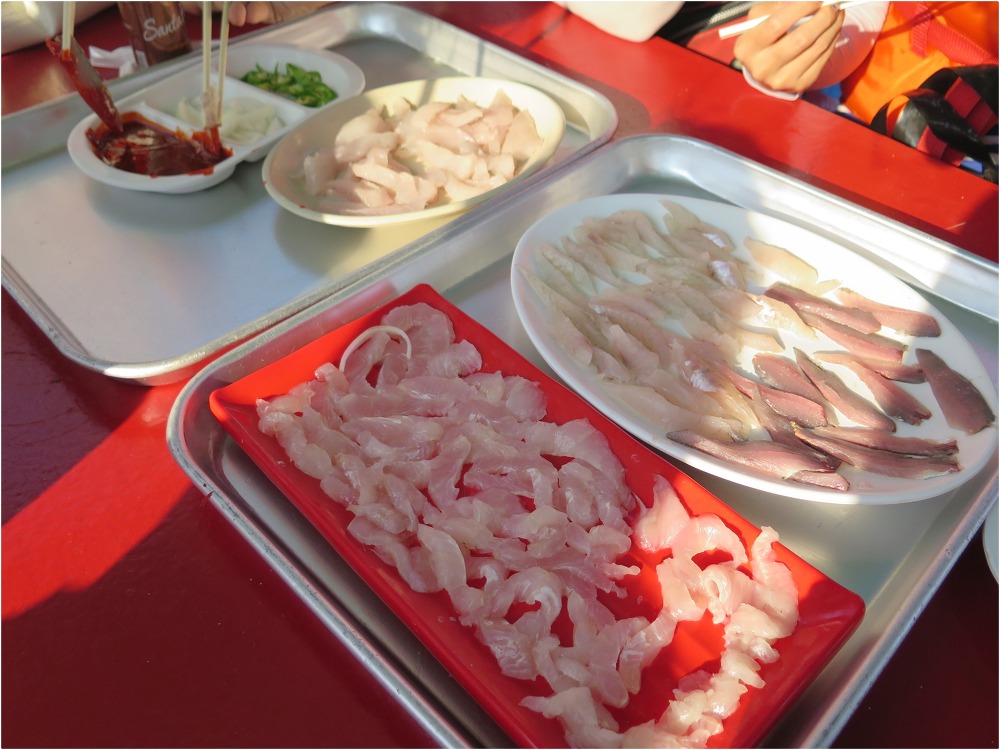 낚시를 실컷 하고 회쳐주는 이모님의 권유로 잡은 고기들로 회를 쳐서 배 위에서 회와 맥주를 조금 마셨어요. (저는 콜라~).