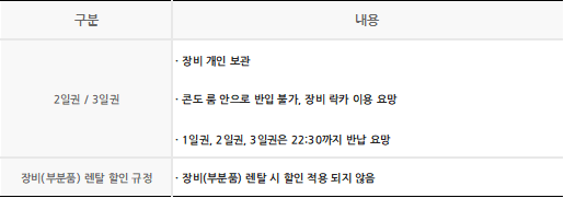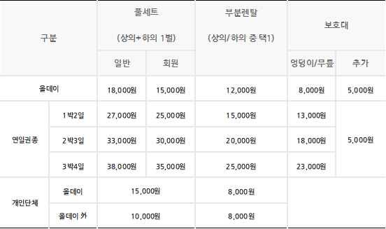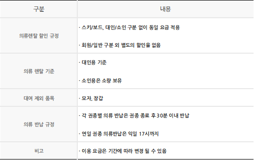 • 휘닉스 스노우 파크 의류 렌탈 옵션: 올데이권, 연일권 등 다양한 옵션을 통해 의류를 렌탈할 수 있습니다. 개인 또는 단체에 따라 렌탈 가격이 책정되며, 의류 렌탈에 대해서는 별도의 할인 혜택이 없습니다.