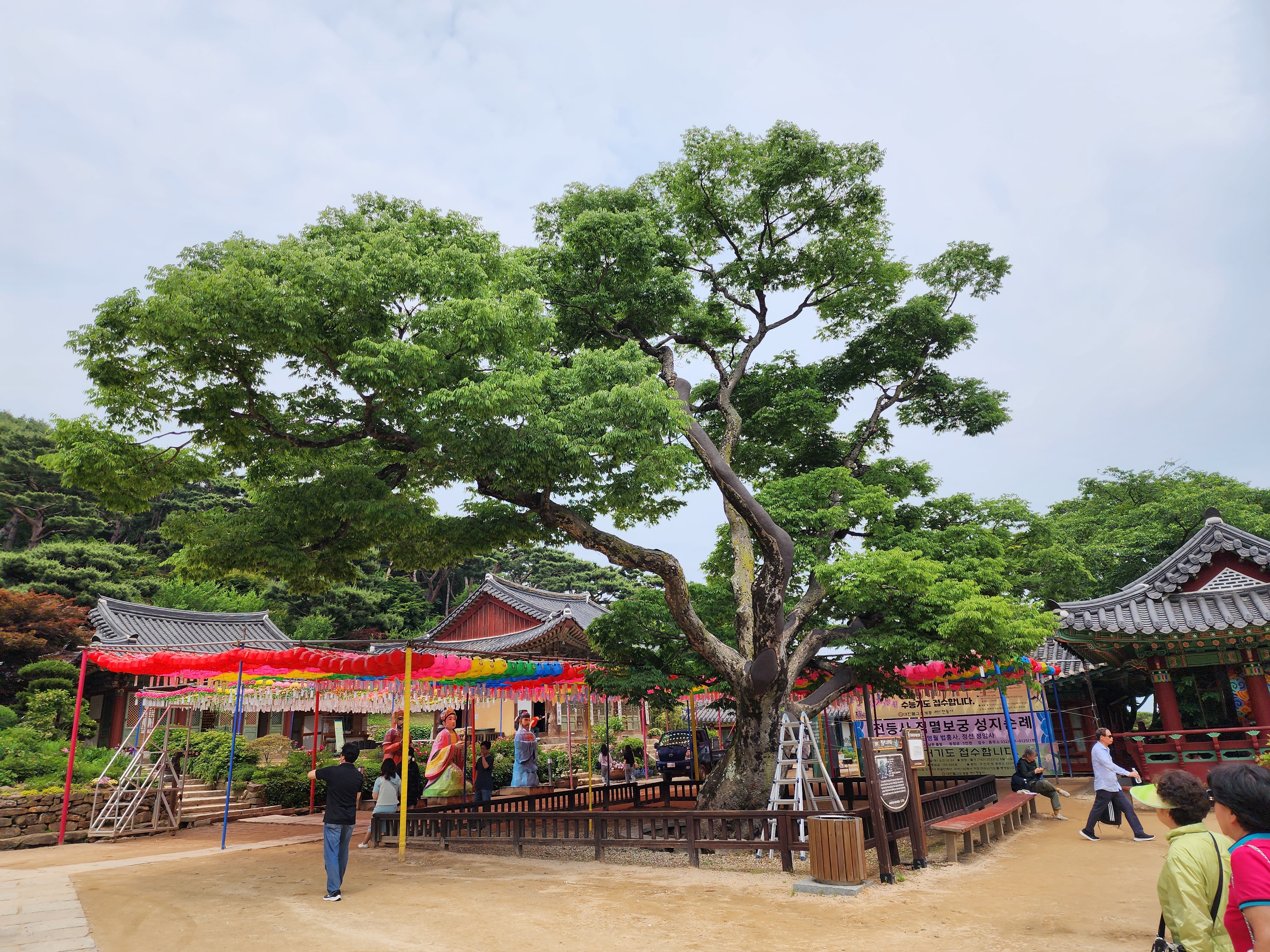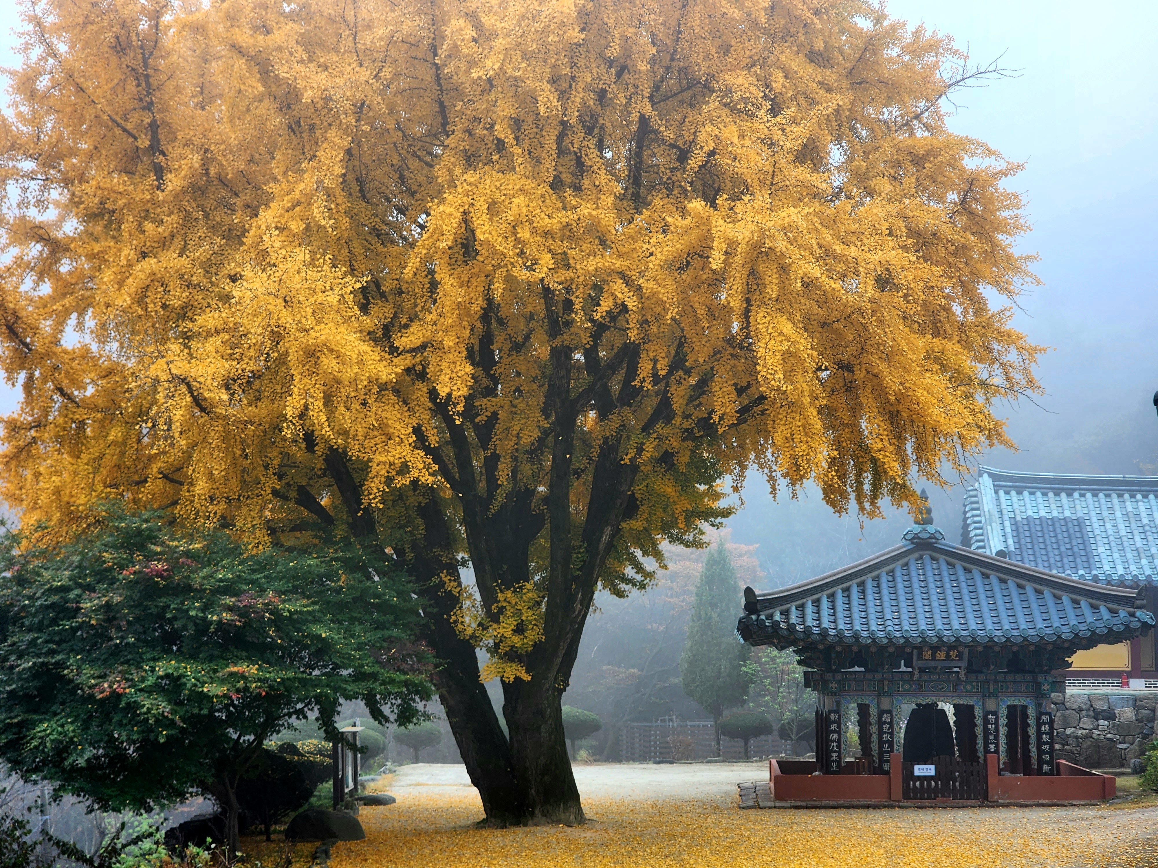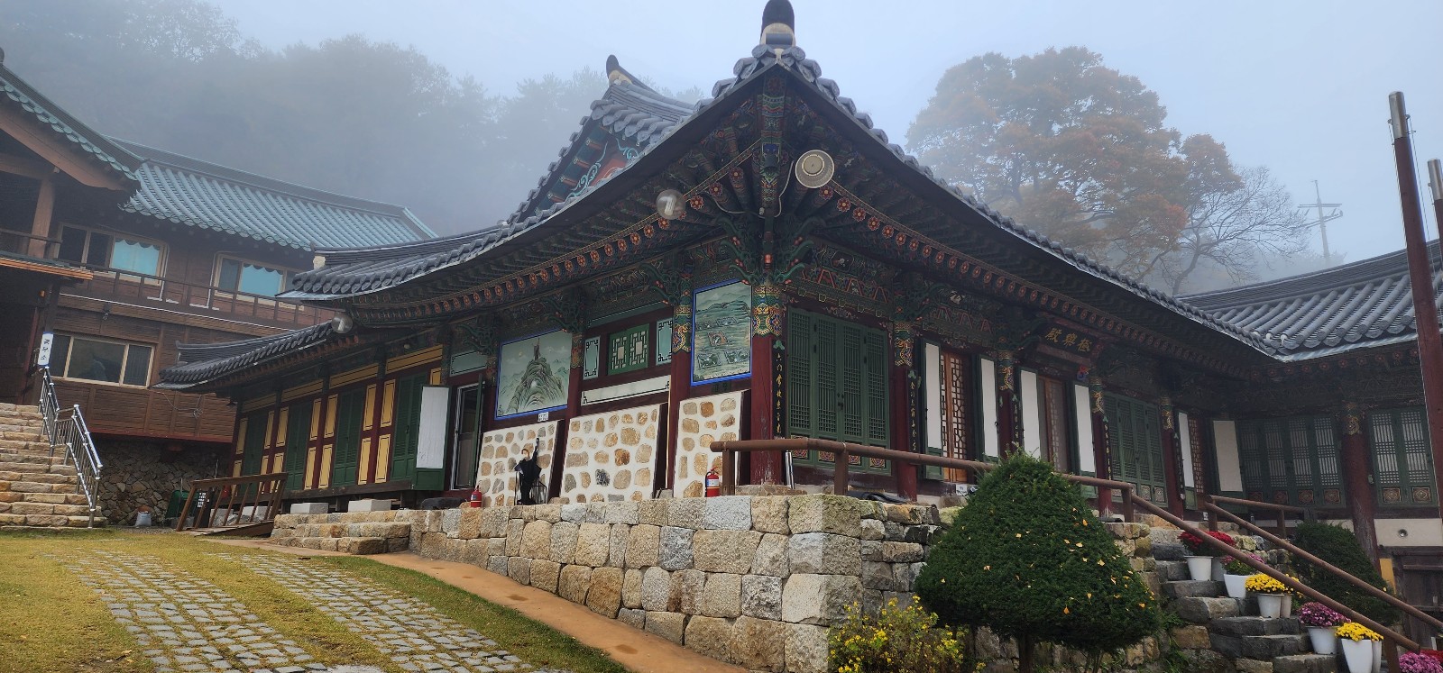 사찰로 들어서는 입구에 서 있는 수령이 오래된 느티나무는 방문객들을 따뜻하게 맞이해 주며, 이 나무들은 모두 보호수로 지정되어 있습니다. 주차장 근처에서는 구절초와 소국이 이슬을 머금은 듯 아련한 아름다움을 발산하고 있어, 날씨가 흐려도 그 꽃의 아름다움은 전혀 퇴색하지 않는다고 해요.