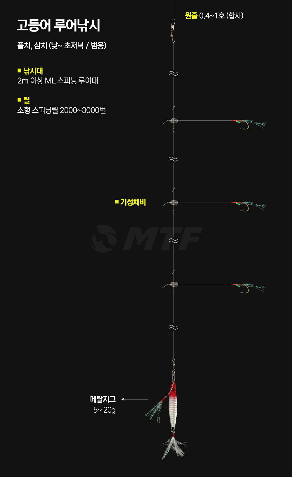 고등어 낚시를 위한 채비는 주로 다음과 같은 요소로 구성됩니다: