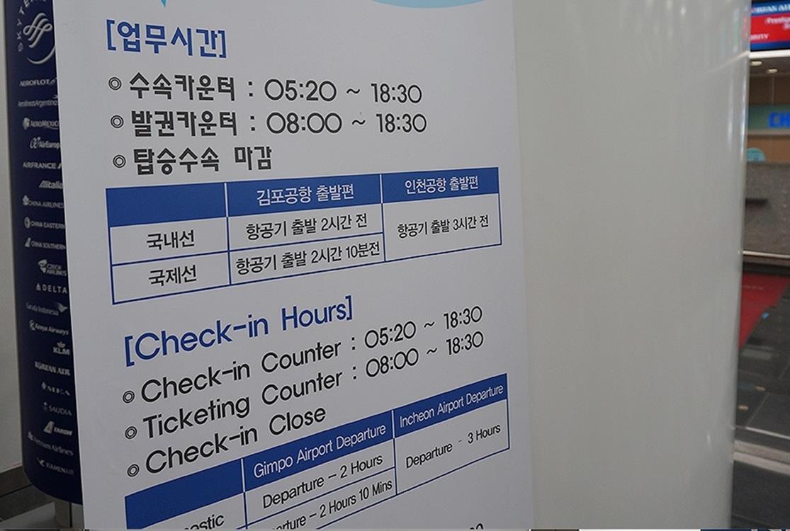 하지만 짐을 미리 부치시려면 인천공항 국제선은 항공기 출발 3시간 전에 수속을 마치셔야 돼요. 김포공항 국내선은 2시간 전, 김포공항 국제선은 2시간 10분 전에 수속하셔야 합니다.