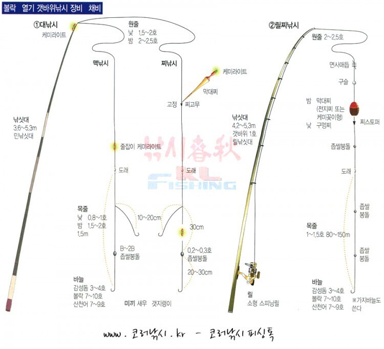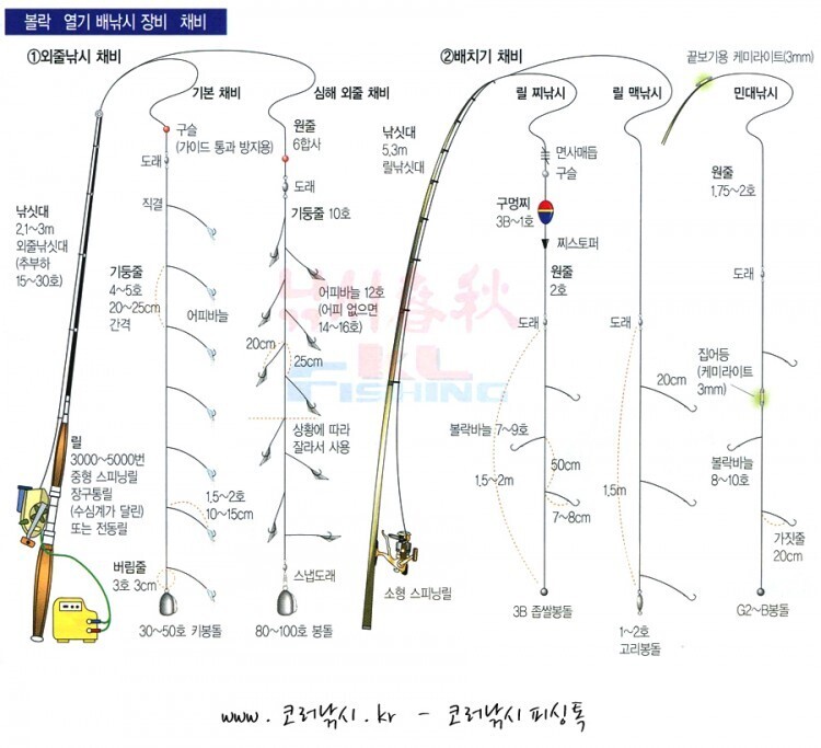- 채비: 릴찌낚시채비, 릴 맥낚시채비, 민대낚시로 채비를 구분하여 사용합니다.