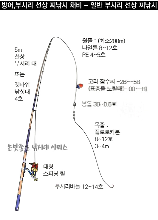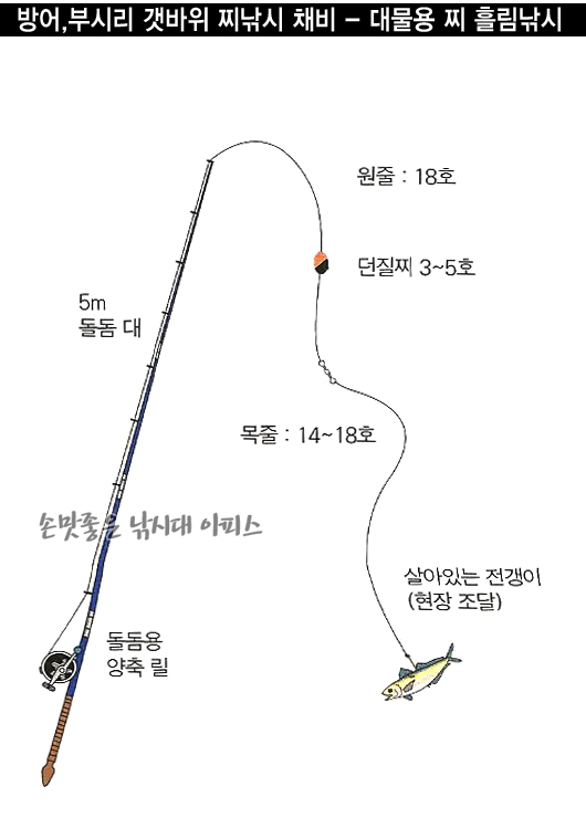 부시리 낚시, 방어 낚시, 갯바위 찌낚시, 선상 낚시, 쇼어지깅, 지깅 낚시, 스피닝릴, 플로로카본 목줄, 전유동 구멍찌, 포핑 루어낚시