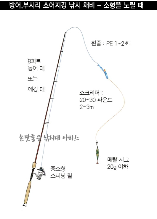 소형 부시리와 방어를 위해서는 8피트 농어대 또는 에깅대, 중소형 스피닝릴, 원줄 PE 1-2호, 20-30파운드 2-3m 쇼크리더, 메탈지그 20g 이하를 준비하세요.