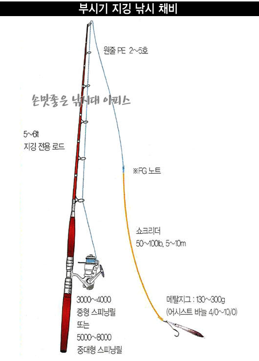 중, 대형급의 부시리와 방어를 노릴 때는 9-11피트 쇼어지깅대와 중대형 스피닝릴, 원줄 PE 3-4호, FG노트 라인시스템, 50-100파운드 3m 쇼크리더, 100g 이하 메탈 지그, 트레블 훅 또는 어시스트훅이 필요합니다.