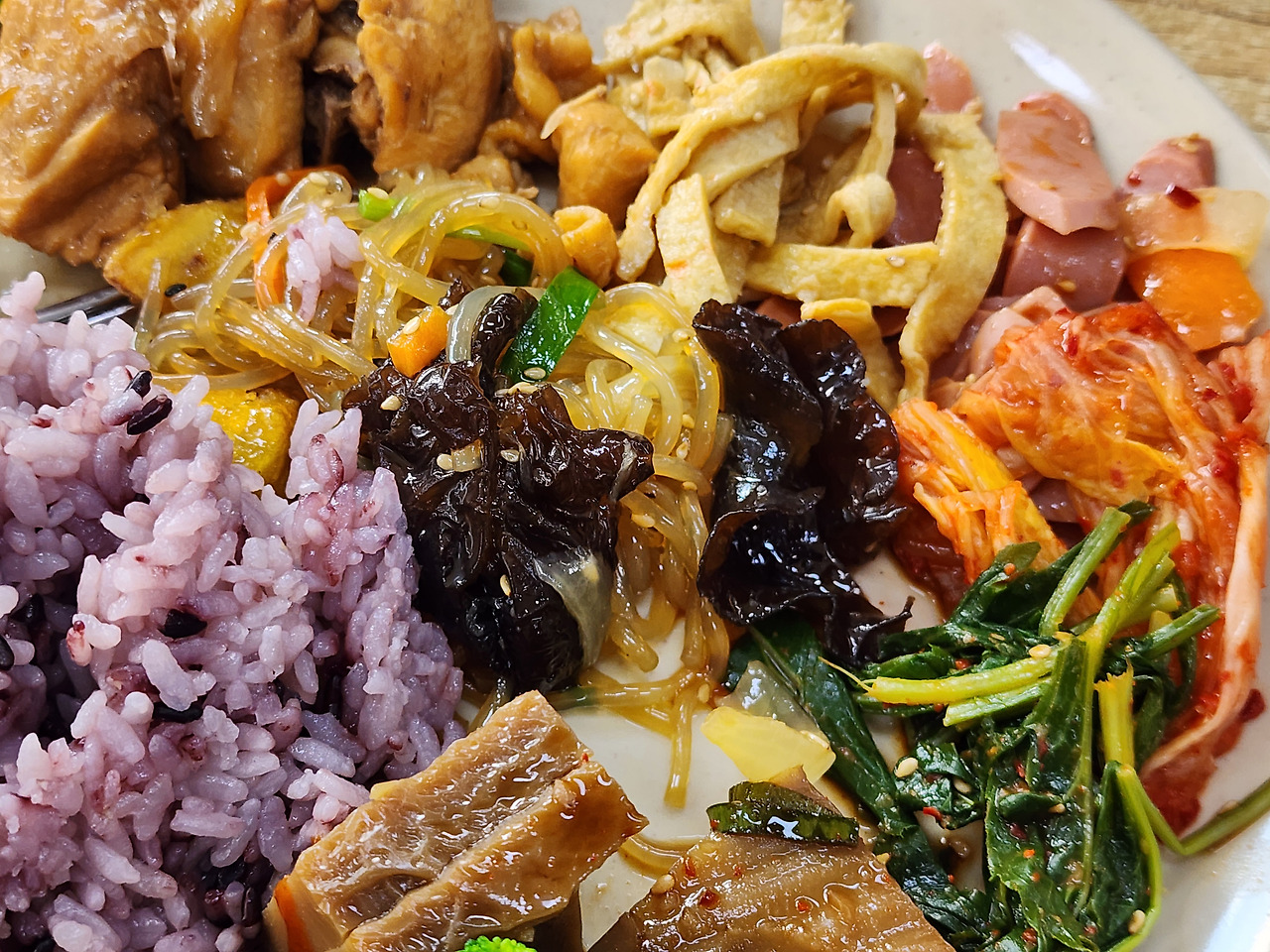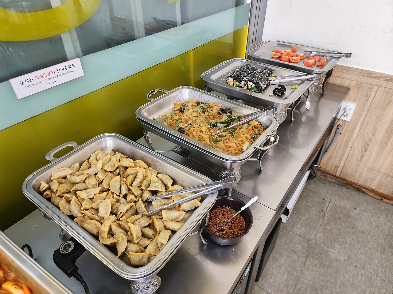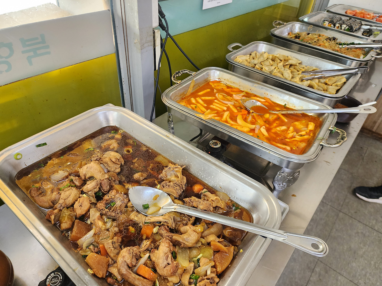 북항 한식뷔페는 매일 아침 5시 반부터 영업을 시작하여 새벽 시간에 식사를 원하는 분들에게 안성맞춤입니다. 메인 메뉴와 다양한 반찬들이 제공되며, 오늘의 메인 메뉴는 간장찜닭이었습니다. 그 외에도 떡볶이, 고구마맛탕, 샌드위치, 김밥, 잡채 등이 준비되어 있었으며, 메인 국은 순두부찌개, 서브 국은 선지해장국이었습니다. 이곳의 김밥은 특히 맛있기로 유명하지만, 잔치국수 육수가 미지근한 점이 아쉬웠습니다.