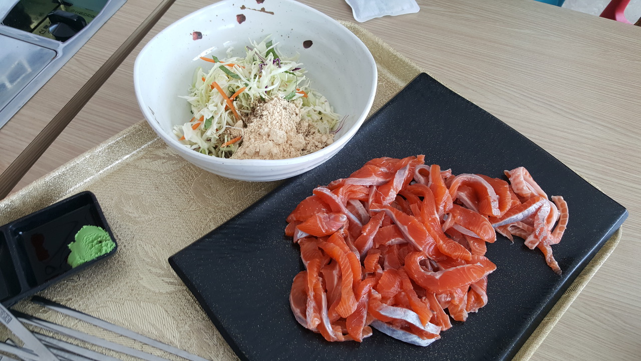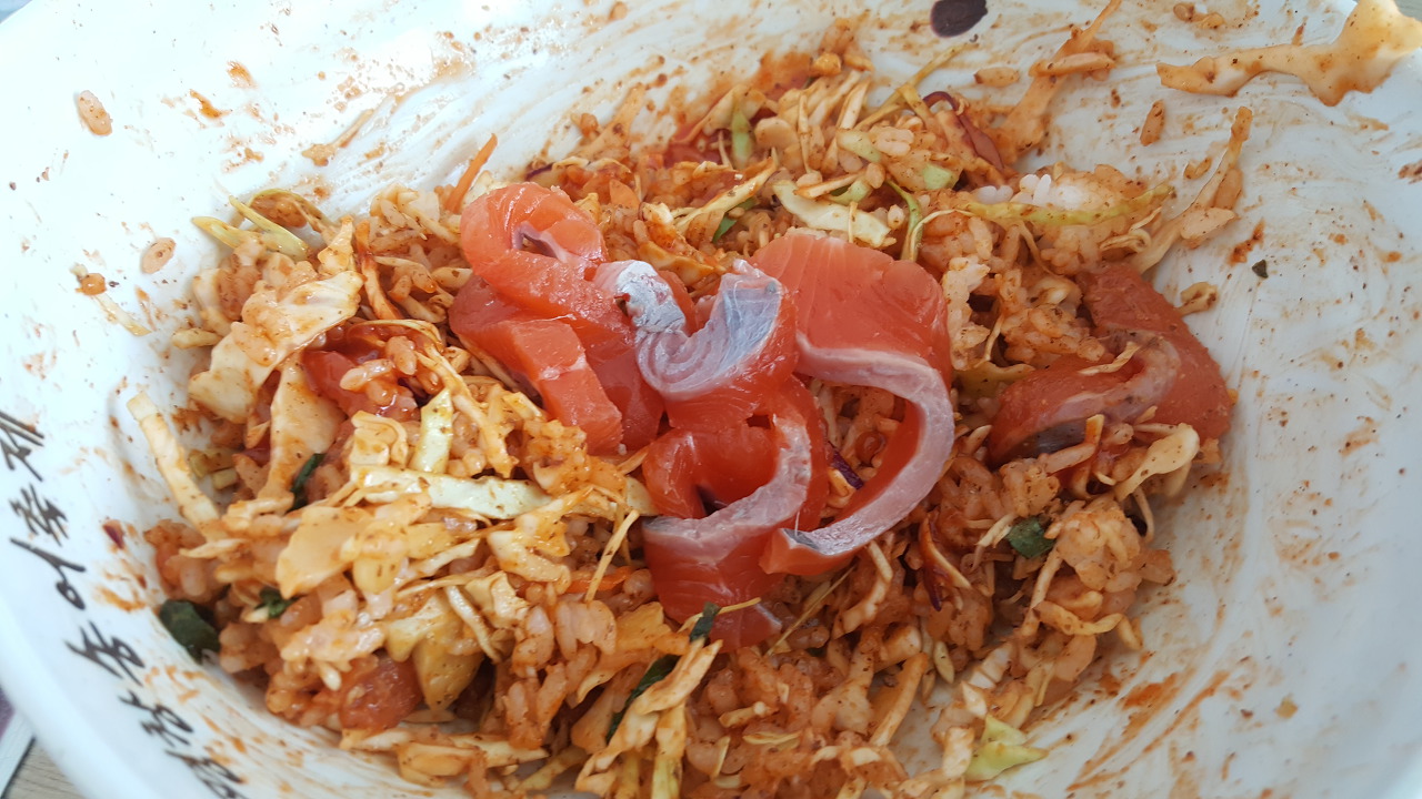 비빔 야채와 공깃밥을 따로 주문해서, 송어회 몇 점을 넣어서 송어회덮밥을 만들어 먹어보았습니다.