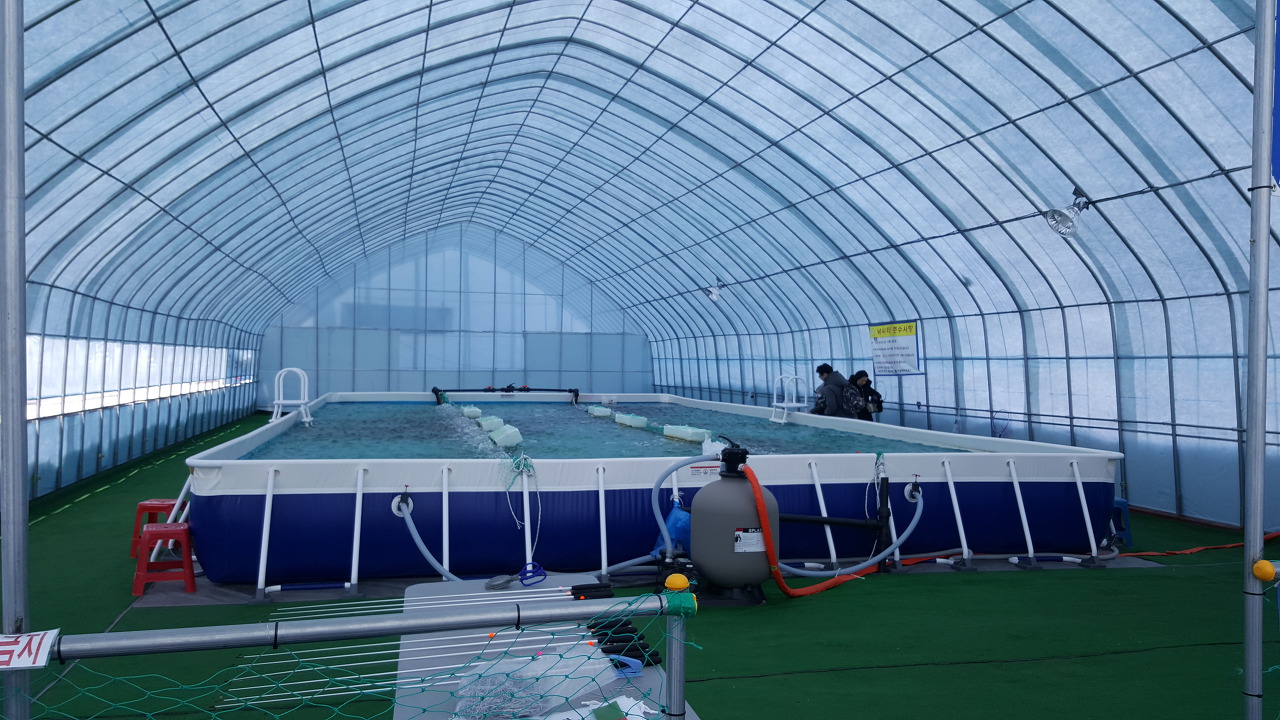 간이 수영장 수조에 송어를 풀어서 1미터 남짓의 간이 낚싯대로 송어 낚시를 할 수 있게 해 놓았습니다.