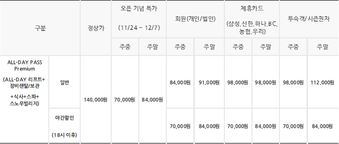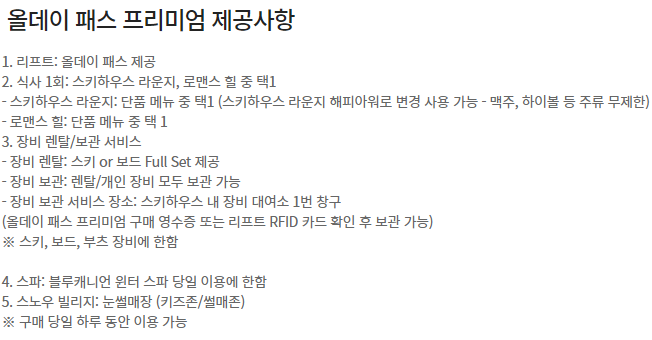 - 올데이 패스 프리미엄: 하루 종일 리프트 이용, 스키와 보드 풀세트 렌탈, 스카이하우 라운지 또는 로맨스 힐에서의 1회 식사, 당일 스파 이용 및 눈썰매장 이용 가능