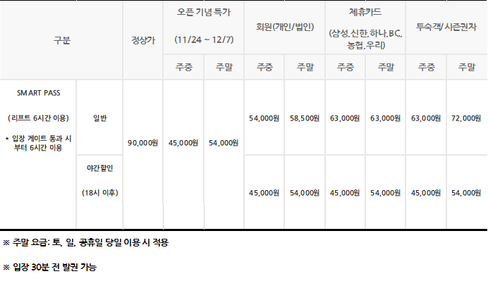 현재, 올데이 패스 프리미엄 및 스마트 패스는 오픈 기념 특가로 제공되며, 신용카드 사용 시 추가 할인 혜택이 제공됩니다. 또한, 18시 이후에 이용하는 방문객들에게는 주중 반값 할인이 적용됩니다.