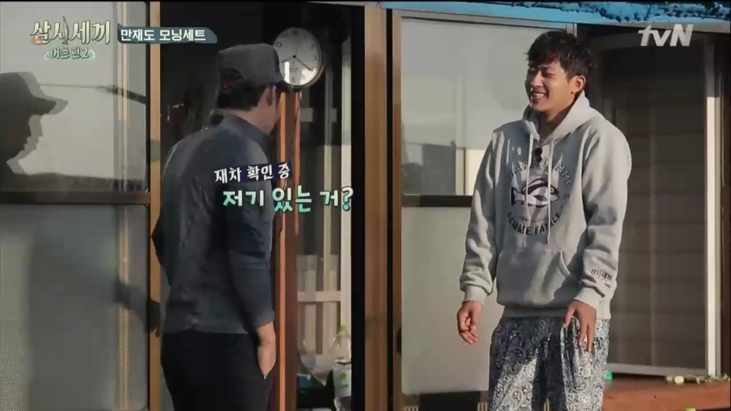 셋을 속이려고 근처 이장님댁에서 잠복하며 아침챙겨 드시는 유해진과 나피디