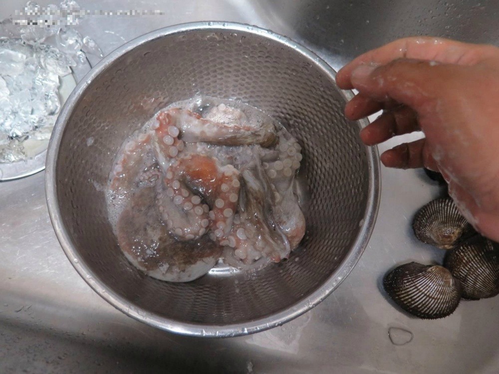 문어 손질법 3. 밀가루와 소금을 이용해서 점액 질과 빨판 사이의 이물질을 제거한다.