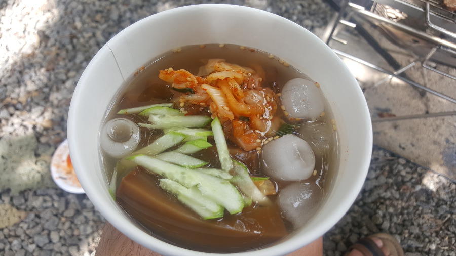 캠핑 고수가 직접 캠핑장에서 묵을 쒀서 만든 도토리묵 요리.