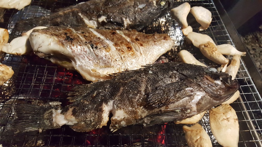 캠핑 저녁은 낚시로 잡아놓았던 참돔과 우럭 소금구이!